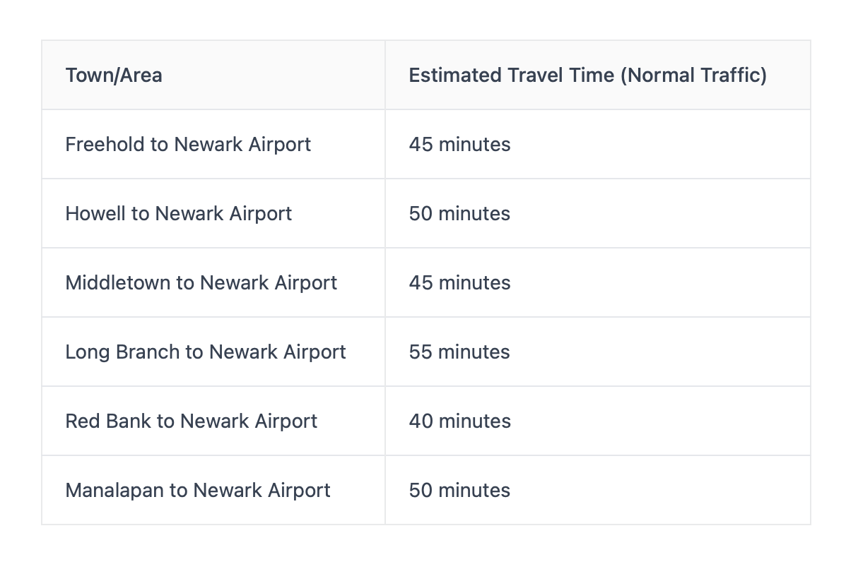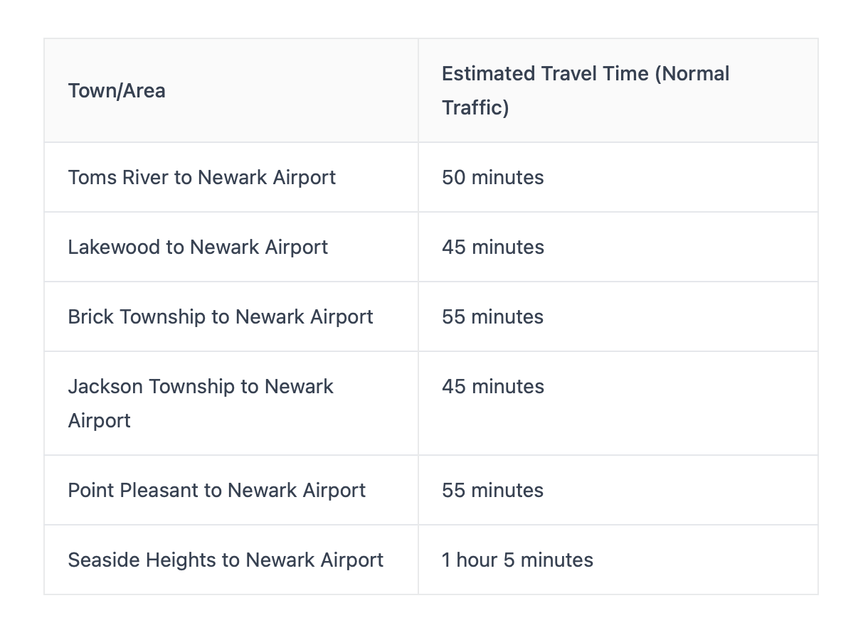 Ocean County is a pretty spread-out area, and getting to EWR can take a bit. Here’s a rough idea: