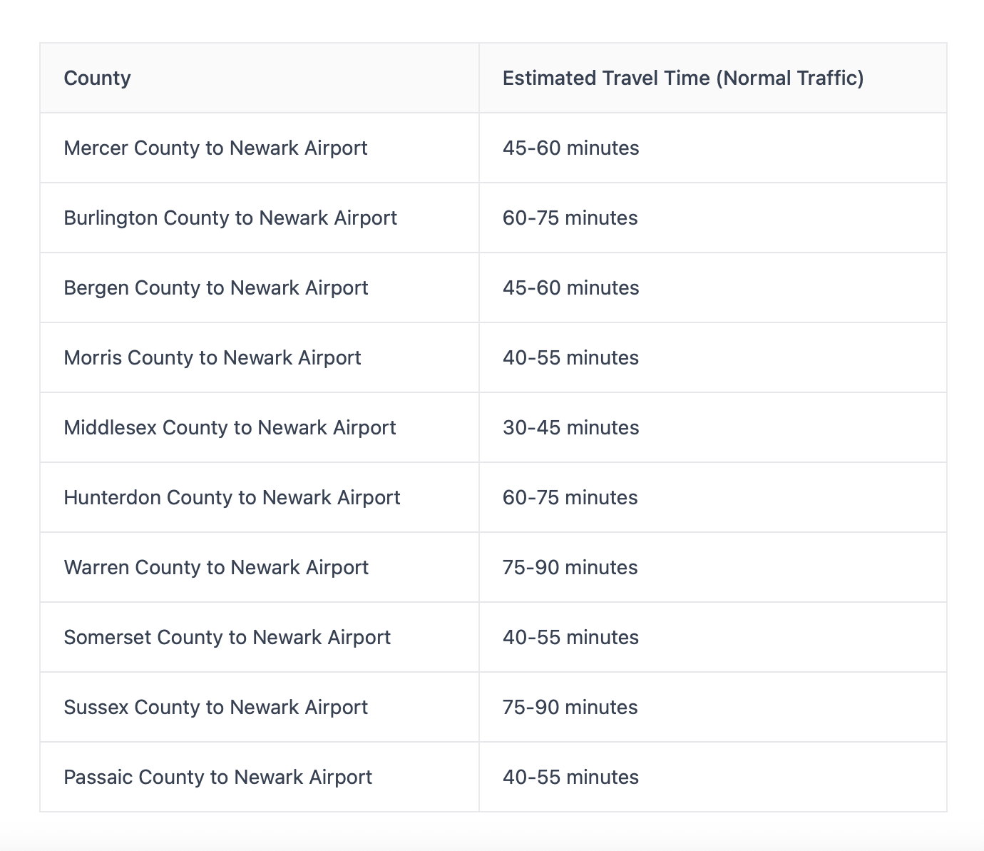 Here are estimated travel times from various counties in New Jersey to Newark Airport (EWR). These times are based on normal traffic conditions. Please remember to add extra time for peak hours, holidays, or adverse weather/road conditions.