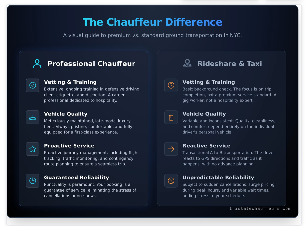 When navigating the bustling streets of New York City, the choice between a chauffeur, a taxi, or a ride-share driver can define your entire experience. While all three get you to your destination, only one offers a truly first-class journey. The fundamental difference lies not just in the vehicle, but in the professional behind the wheel: a career expert dedicated to your comfort versus a gig worker focused solely on the trip.