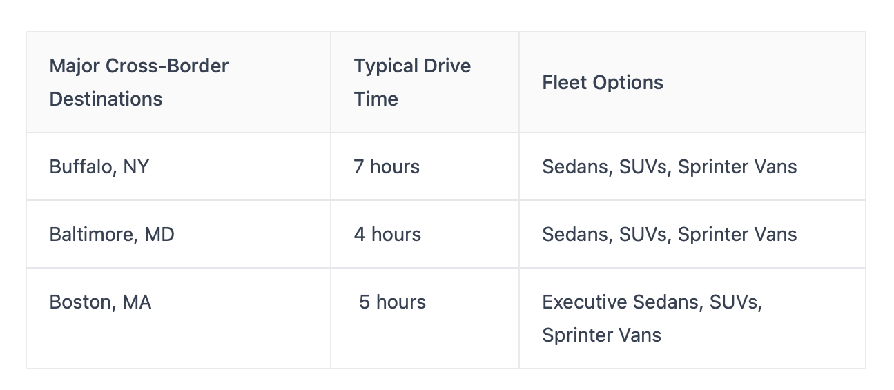 When evaluating cross-border providers, ask about vehicle licensing and insurance for both states, and confirm experience with both leisure and business travelers. Not all fleets offer the same level of reliability or comfort when international travel is involved, so tailored service makes a difference.