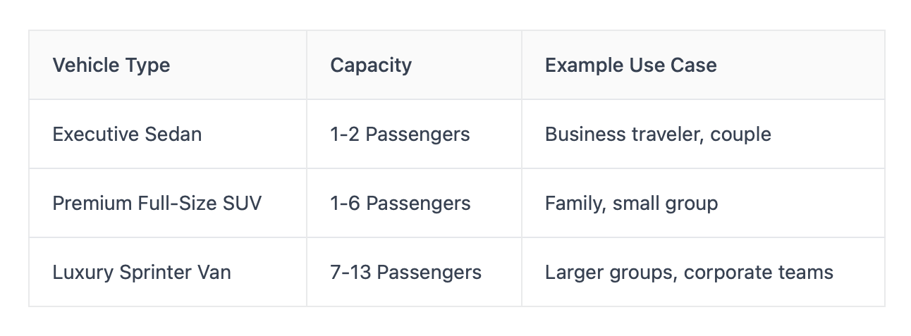 - Executive Sedans: Perfect for 1-2 passengers, offering a sleek and professional travel experience.